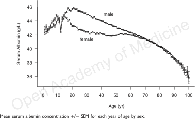 - Weaving G, Batstone GF, Jones RG. Age and sex variation in serum albumin concentration: an observational study. Ann Clin Biochem. 2016. 53(Pt 1):106-11. doi: 10.1177/0004563215593561.
