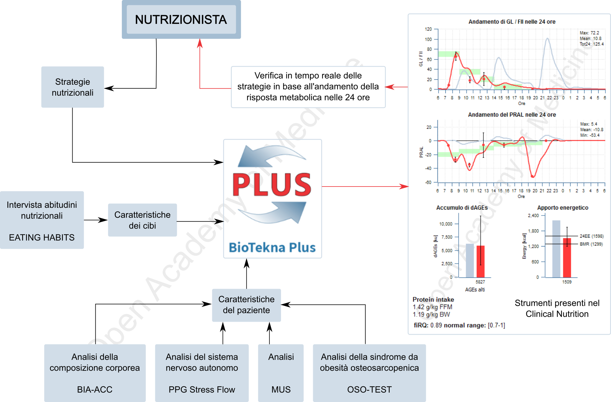 Attualmente la tecnologia applicata alla nutrizione clinica ha comunque raggiunto stadi più avanzati, un esempio in questo senso deriva dall’esperienza, attiva da tempo ed accessibile ad una vasta comunità di utilizzatori, rappresentata dalla piattaforma integrata BioTekna Plus (applicazione “Clinical Nutrition“), che permette di effettuare elaborazioni nutrizionali in tempo reale a partire dai parametri BIA-ACC, PPG Stress Flow e da interviste sulla sintomatologia vaga ed aspecifica (MUS) e sulle abitudini nutrizionali del paziente (Eating Habits).