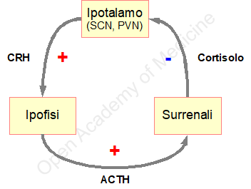 Il ritmo circadiano fisiologico dell’asse HPA è fondamentalmente regolato al livello dell’ipotalamo [7], precisamente dalla regione del nucleo soprachiasmatico (SCN, SupraChiasmatic Nucleus), situata immediatamente al di sopra del chiasma ottico e collegata alle rètine mediante il tratto retino-ipotalamico. Detta regione è connessa al nucleo paraventricolare (PVN, ParaVentricular Nucleus), sede principale di sintesi del CRH (Corticotropin Releasing Hormone). I recettori di CRH dell’adenoipofisi (nucleo anteriore dell’ipofisi) controllano la sintesi ed il rilascio di ACTH (AdrenoCorticoTropic Hormone o corticotropina) nel flusso sanguigno. L’ACTH agisce sui recettori di membrana delle cellule corticosurrenali, stimolando la produzione di diversi ormoni, prevalentemente cortisolo (oltre ad altri glucocorticoidi, mineralcorticoidi, deidroepiandrosterone ed ormoni sessuali) [HPA axis index – BIA-ACC].