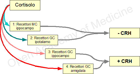 Nel cervello, il Cortisolo trova grande affinità nei legami con recettori di mineralcorticoidi (MC) presenti nell’ippocampo, risulta invece meno affine ai legami con i recettori di glucocorticoidi (GC) nell’ipotalamo, nell’ipofisi ed in altre zone della struttura cerebrale. La tipologia di recettori coinvolti nei legami con il cortisolo è un fattore direttamente coinvolto nel mantenimento del ritmo circadiano del rilascio di CRH: i legami con i ricettori di mineralcorticoidi prevalgono nella prima fase notturna (durante la fase di abbassamento del livello di cortisolo), mentre i legami con i recettori di glucocorticoidi (sia nell’ipotalamo che nell’ippocampo) vengono occupati prevalentemente nell’acrofase del livello di cortisolo, aumentando l’effetto inibitorio di quest’ultimo sulla secrezione di CRH e, conseguentemente, di ACTH.