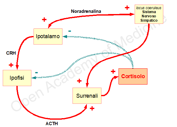 Una delle possibili problematiche relative all’eccessiva concentrazione di cortisolo, è l’attivazione dei recettori di glucocorticoidi presenti nell’amigdala [1,2,7] (causando una reazione simile a quella dovuta ad eccesso di stress emotivo), che si verifica appunto quando il livello di cortisolo è tale da aver già in qualche modo saturato i recettori di ippocampo ed ipotalamo: questa situazione comporta un’inversione del feedback fisiologico del cortisolo, stimolando la sintesi di CRH (proinfiammatorio a livello periferico), con l’estrema conseguenza di un’ulteriore stimolo della corteccia delle surrenali alla produzione di cortisolo, da cui la perdita del ritmo fisiologico dell’asse HPA, nonché la modifica della sua regolazione omeostatica.