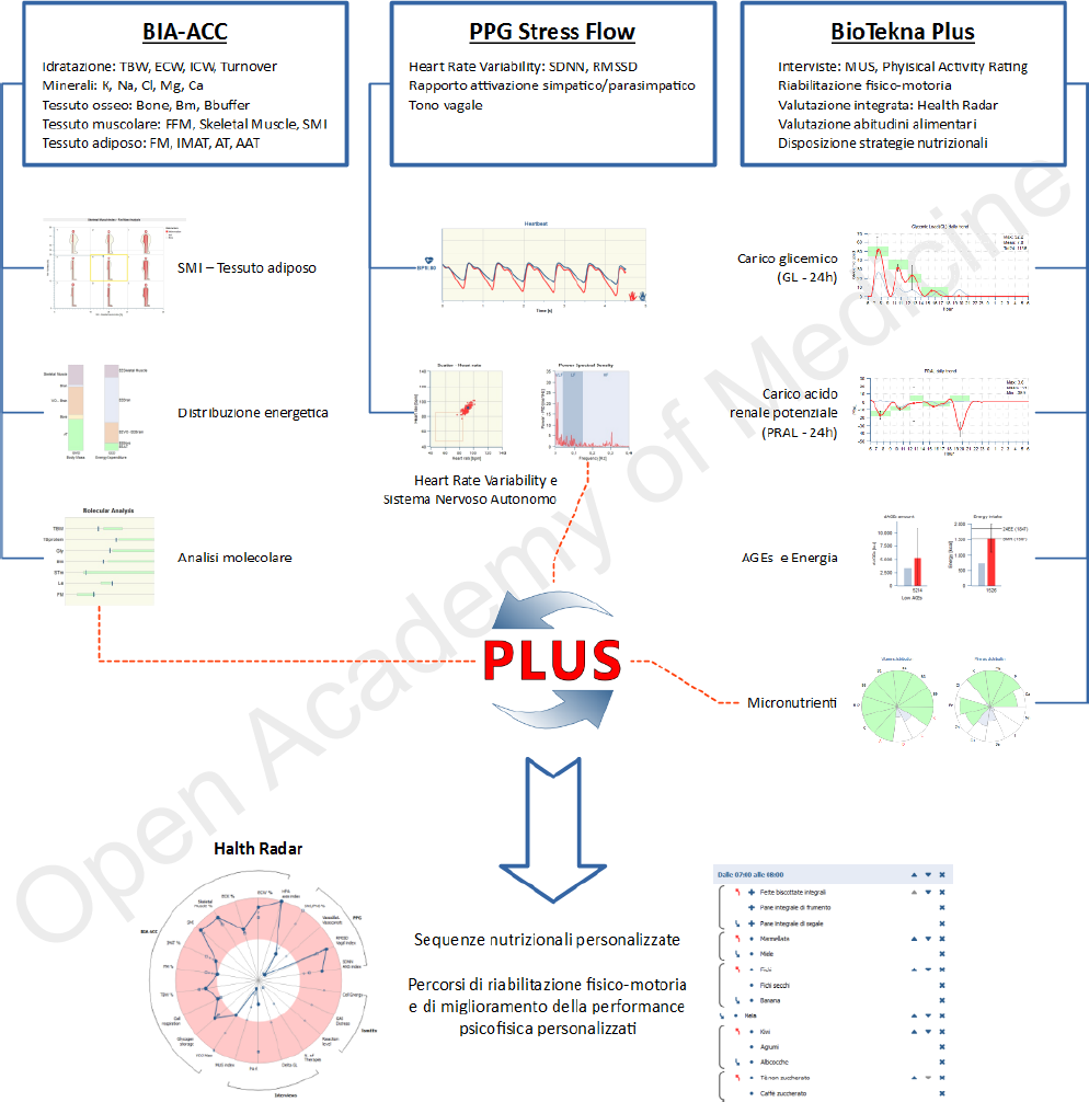 Tutti i parametri menzionati possono essere messi in relazione con le abitudini nutrizionali grazie alla piattaforma software BioTekna Plus, in grado di sintetizzare, attraverso il diagramma Health Radar, i parametri dei test di composizione corporea, sistema nervoso autonomo e variabilità della frequenza cardiaca, oltre ai dati rilevati da interviste validate relative alla sintomatologia vaga e aspecifica e alle abitudini nutrizionali: la complessiva elaborazione di queste informazioni permette di valutare l’andamento della risposta metabolica nelle 24 ore (valutazione di carico glicemico GL, carico acido renale potenziale PRAL, prodotti finali della glicazione AGEs) evidenziando problematiche legate alla risposta dell’organismo agli alimenti assunti quotidianamente.